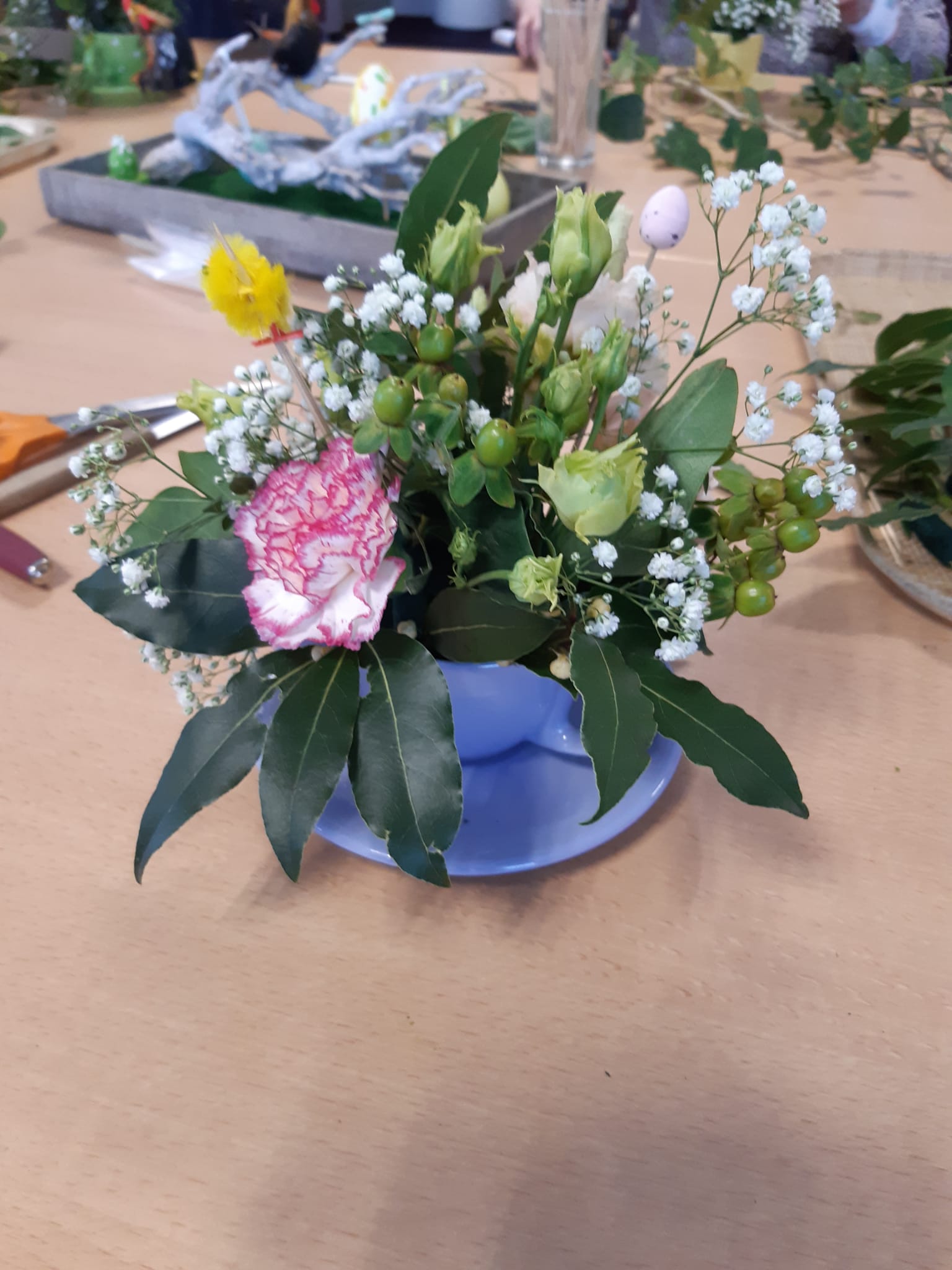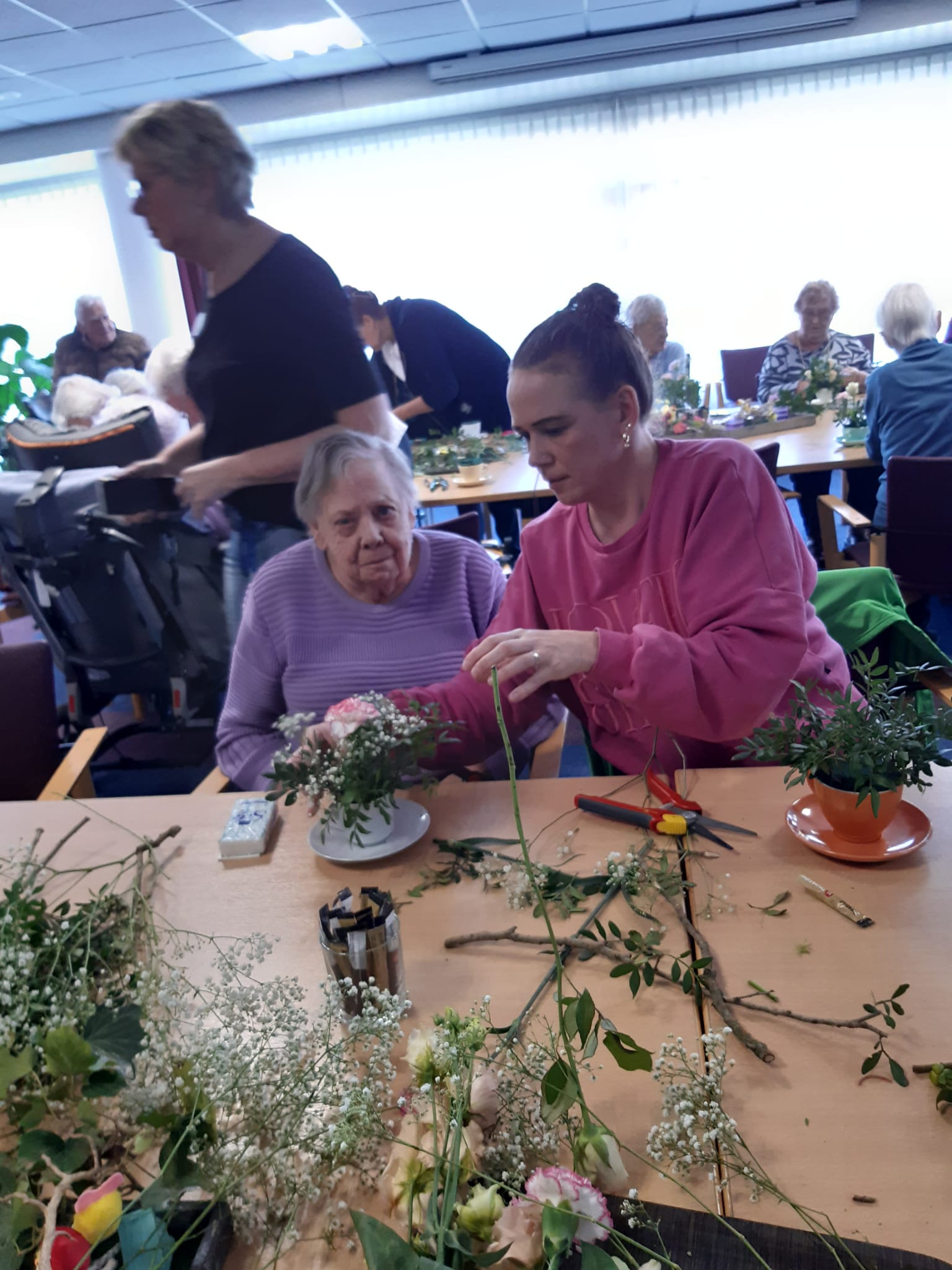 Daarna gingen we aan de slag en wat was het mooi om te zien hoe iedereen aan het werk was. Soms werd er geholpen met het stukje maken en andere gingen heerlijk zelf aan de slag. Er werd volop gekletst en tegelijk hard gewerkt. Het resultaat waren mooie bloemstukjes.